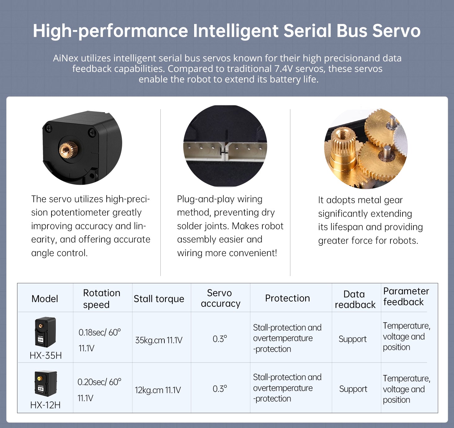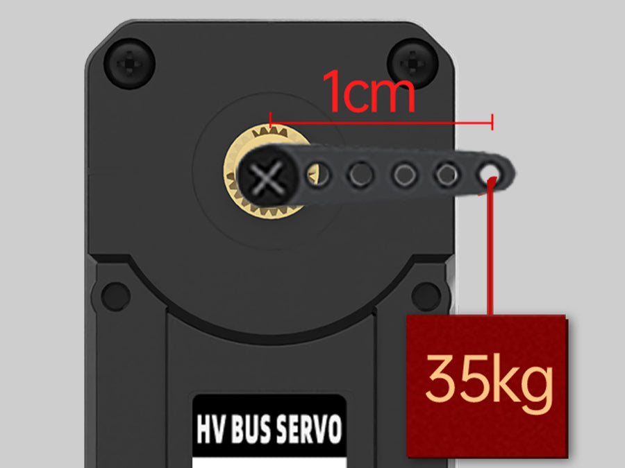 |   Non-contact Magnetic Encoder FeedbackUnlike the traditional position feedback mechanism using a potentiometer, the HX-35HM servo employs non-contact magnetic feedback. This feature enhances service life, reduces size, and improves shock resistance. |   High Precision Magnetic EncoderCompared with potentiometer, the 12-bit high-precision angle magnetic encoder sensor extends its angle range to 360 degrees while maintaining a 4096-bit absolute position accuracy. |   35KG Strong TorqueThe stall torque of the HX-35HM servo reaches 35kg.cm under 12V voltage, giving your robot more power. |   CNC Metal ShellThe HX-35HM servo boasts high accuracy and excellent heat-conducting properties with its aluminum alloy shell. Through anodic oxidation processing, it exhibits robust resistance to corrosion. |