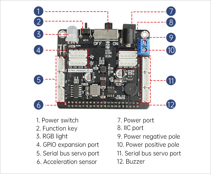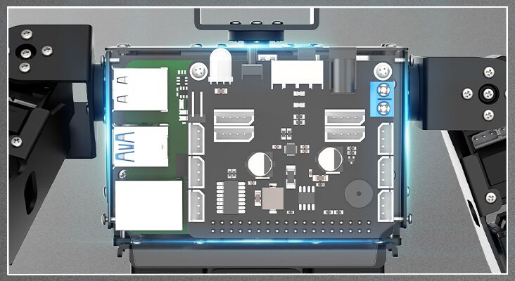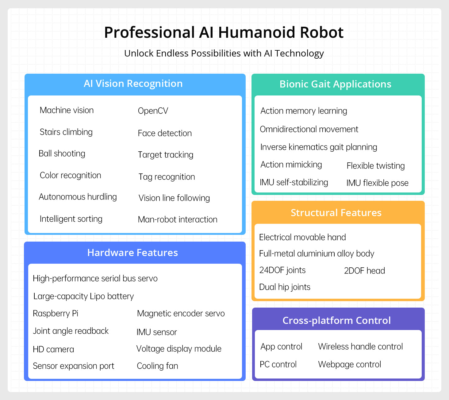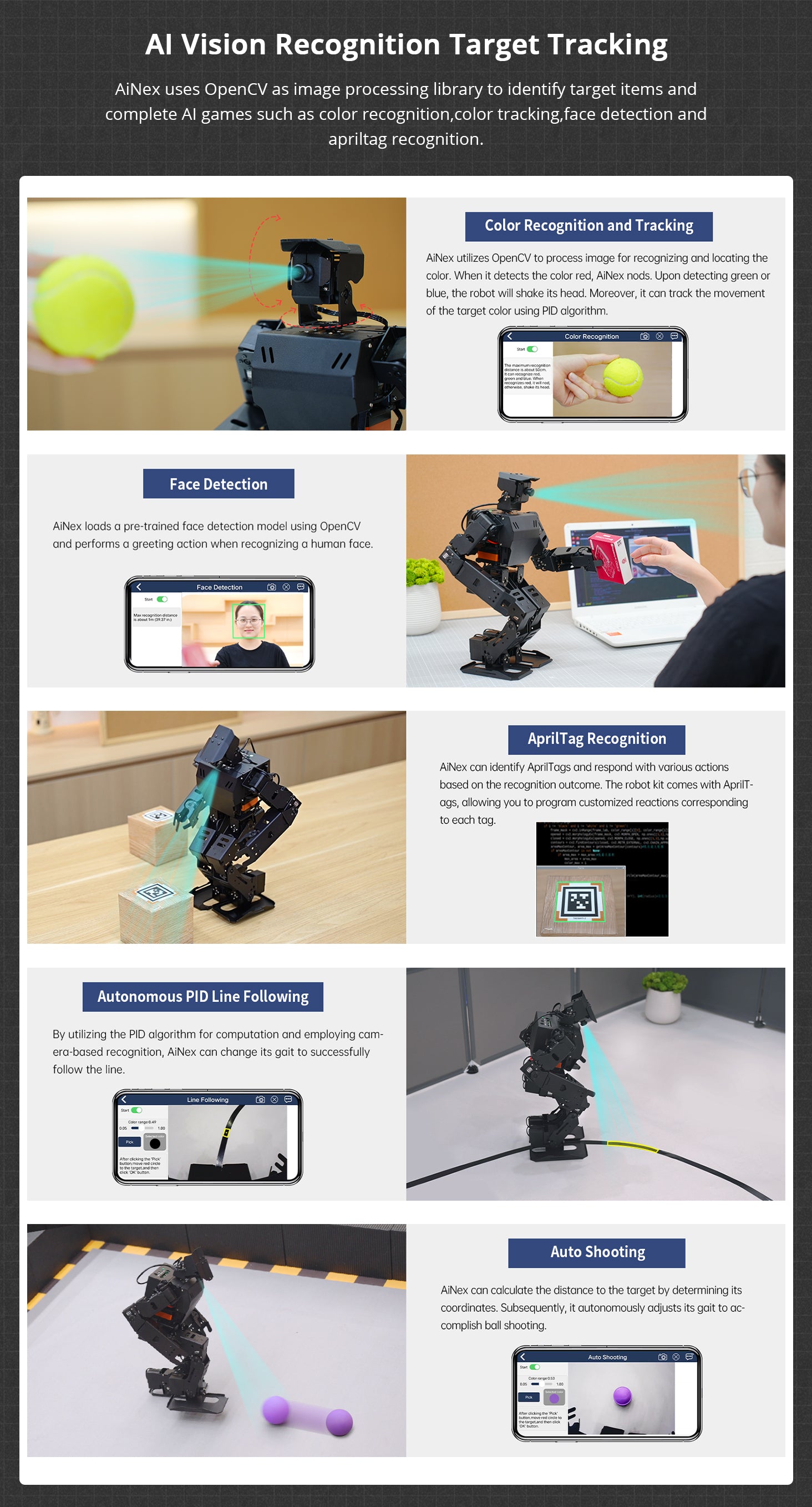 |   2 DOF HD Wide-angle CameraThe head of AiNex is equipped with a 120° high-definition wide-angle camera, which can effectively identify and locate target objects by utilizing OpenCV image processing. |   Powered by Raspberry PiAiNex is controlled by a Raspberry Pi and is equipped with intelligent high-voltage bus servos. It is programmed in Python and can complete a variety of AI intelligent applications such as color tracking and face detection. |