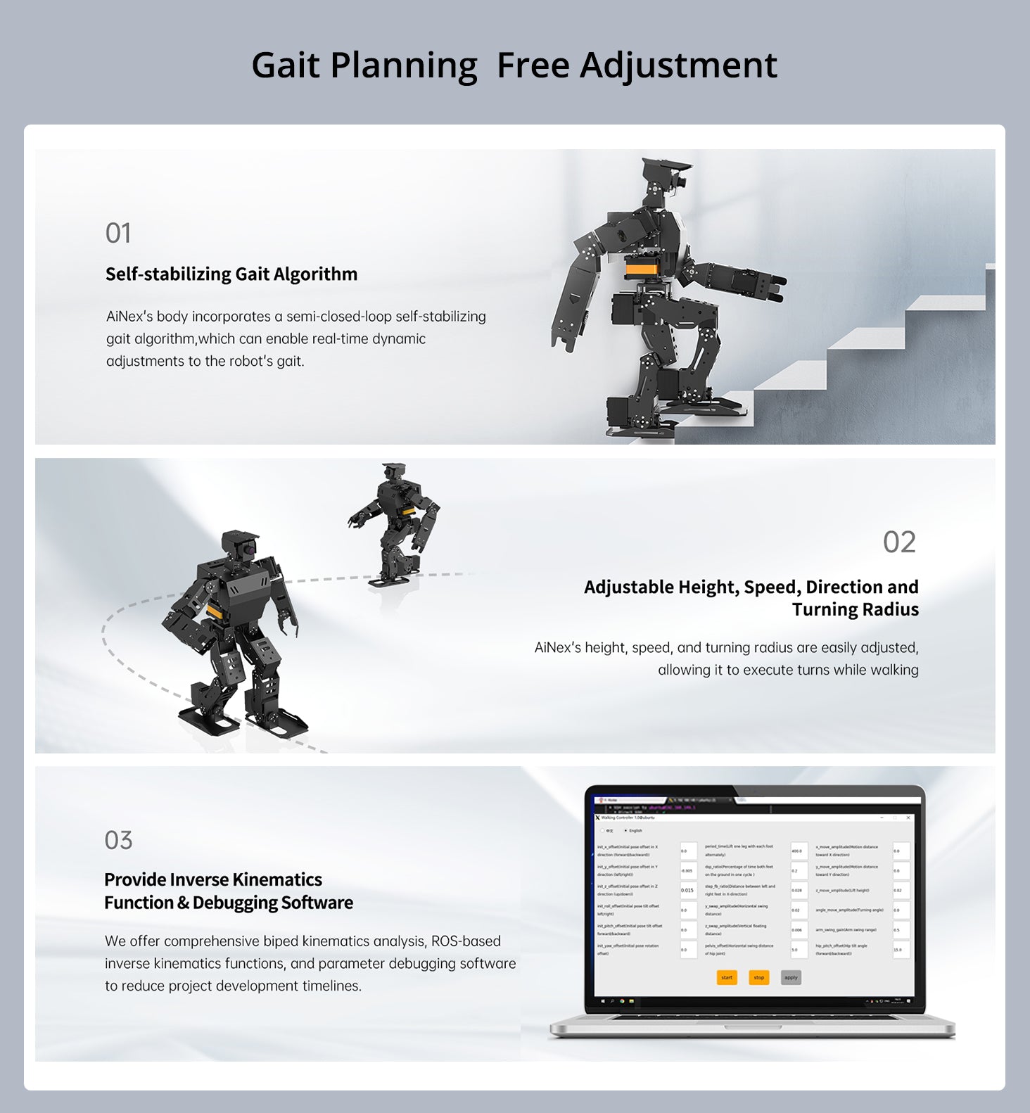 |   Movable Hand Anti-blocking ProtectionAiNex standard can be expanded by mechanical hands, which can flexibly grab and carry small items. The hand servos provide angle and temperature feedback, effectively preventing damage caused by obstructions. |   Dual Hip Joints Original StructureAiNex is equipped with two hip joints to support the rotation of the legs on the Z-axis, making the robot more flexible in turning. The hip joint is equipped with a magnetic encoder bus servo, which provides high accuracy and stability. |