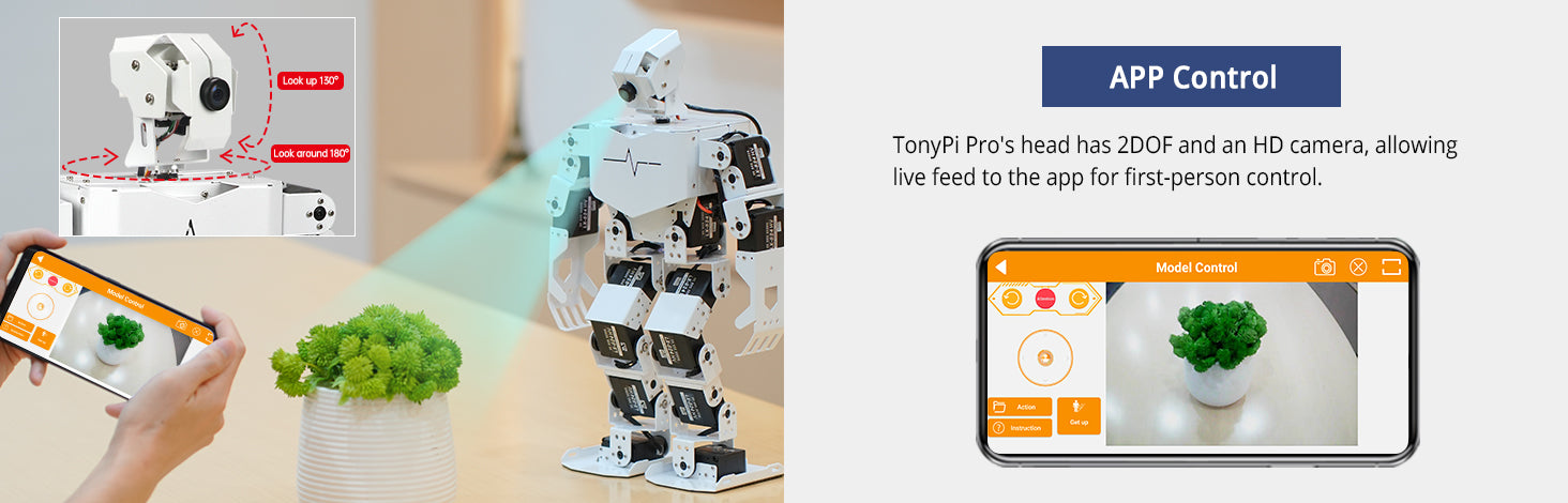 |   APP ControlWonderPi APP supports Android and iOS. Switch game modes easily and quickly to experience various AI games. |   PC Remote ControlWe can quickly connect the WonderPi configuration to the wireless LAN, which is more convenient for you to remotely connect and control TonyPi Pro. |   PC Software ControlWith the graphical PC software, you can control the rotation of the robot servo by dragging the slider without code, and can edit the robot action group. |