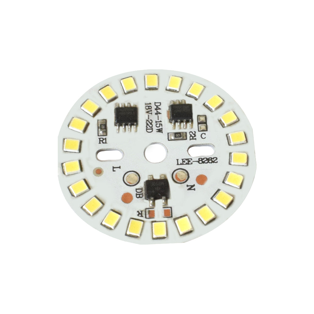This is a 15W DOB LED PCB. It has three IC, MB10F and two FM3081S8HS. And it has a total of 22 LEDs, and the colour of the LED is white. This PCB is mainly used in bulbs. MB10F is a bridge rectifier as a bridge rectifier is used to rectify the AC signal, which means it's used to convert AC to DC voltage directly. This IC is used for the single-phase power supply. And it has an eight-pin IC FM3081S8HS, a single-channel LED linear constant current drive control chip. An external resistor adjusts the output current.