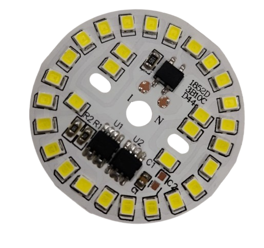 This is a 220V DOB LED PCB; this PCB has two main IC, which are used to drive the full LEDs and one another IC, known as a bridge rectifier. MB10F IC is a Bridge rectifier used to rectify the AC input signal into DC Signal. This IC has four pins, and the polarity has marked on it. This PCB's operating voltage is 220V AC power supply. MLS3535A T is a highly integrated LED driver capable of driving 8 LEDs in parallel for large display applications. Independent LED control allows the selection of a subset of the six main display LEDs for partial-illumination applications.