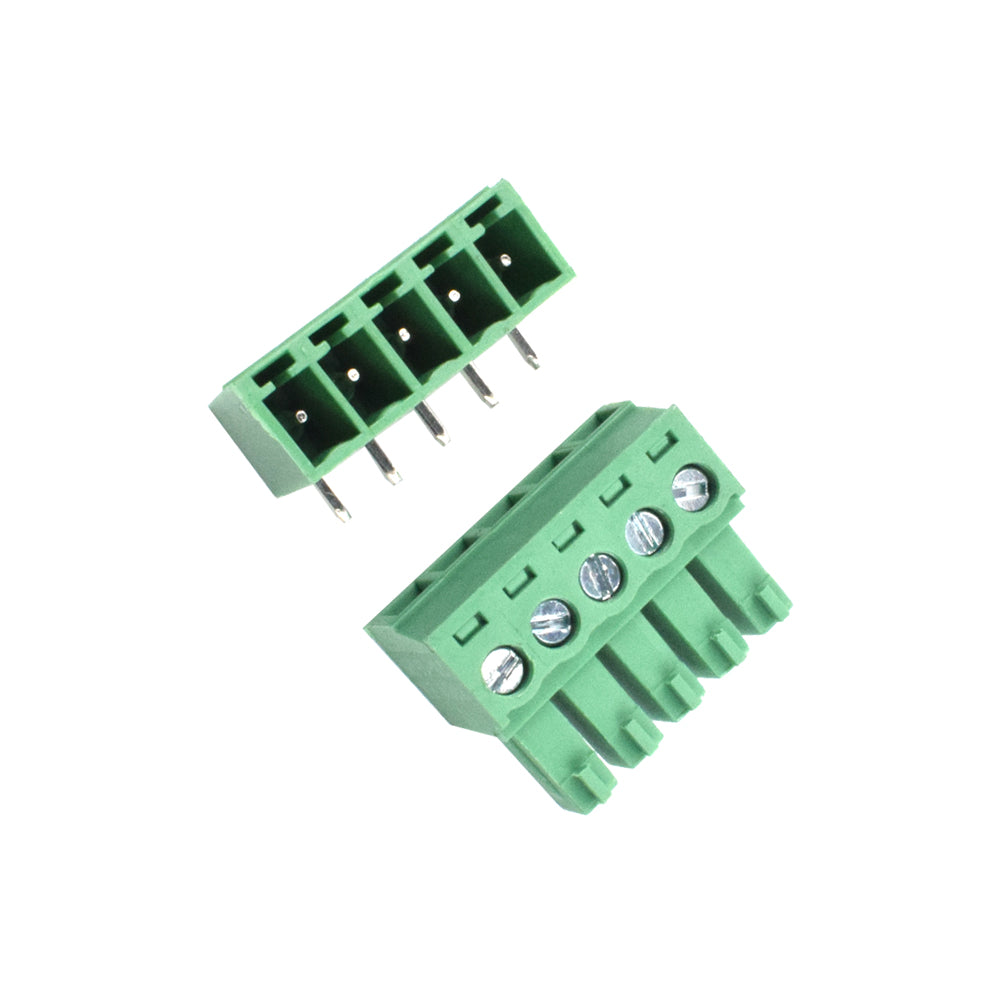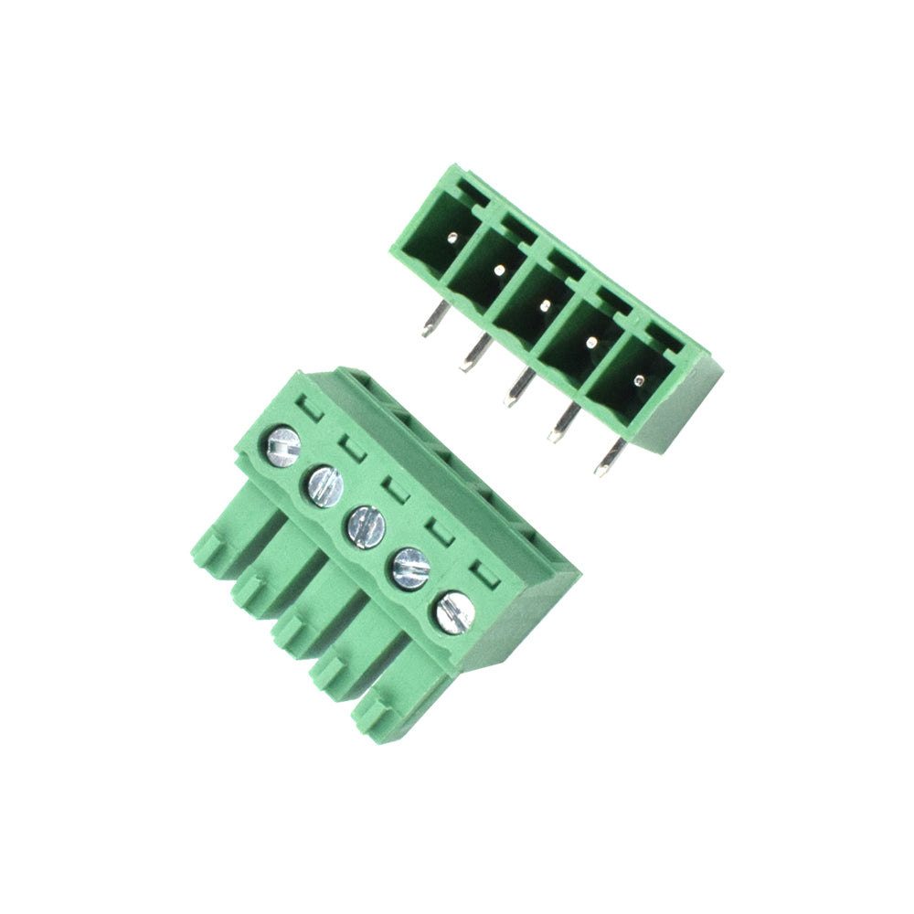 The 5 Pin Female Pluggable Terminal is a Right Angle Terminal with a pitch of 3.81mm that is suitable for the wire to board connectors in various industrial and other electronics products. It is appropriate for use when the PCB is placed inside the enclosure and connections must be accessible from the outside. The wires are held in place by a screw in the connector. Male Connectors are right angle and will fit on the THT PCB Board. A terminal block connector is a component consisting of a plastic housing with metal holdings which is used to connect wires to a circuit. A terminal block is a modular housing with an insulated body that connects two or more wires.