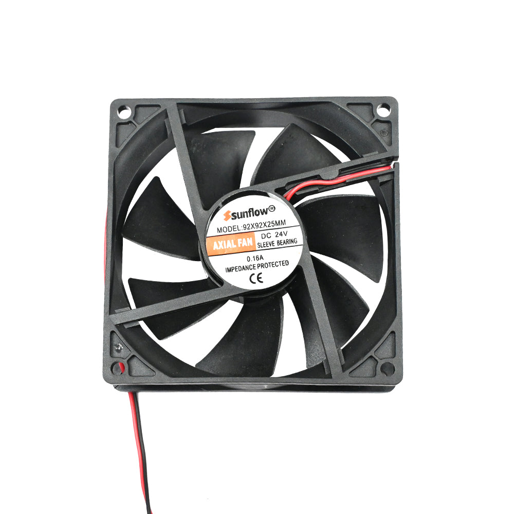 The Axial fan is powered by 24V DC and blows air parallel to the track of the blade axis or along the fan's axis. DC axial fans are used in a wide range of applications, including computing, servers, telecommunication cabinets, and any type of equipment where thermal control is required for improved reliability and life extension of the system's components. Uncontrolled heat generated by electronic devices not only reduces the performance of any system but can eventually lead to system failure. To avoid this trouble, it is critical that your equipment be designed with an efficient cooling system in mind. Axial fans are commonly used for cooling purposes and generate airflow parallel to the axis of the fan blades. These fans are designed to move air in a linear direction, providing effective ventilation. Sleeve bearings, also known as sleeve or plain bearings, are a type of bearing used in fans to reduce friction and provide smooth rotation. They typically consist of a sleeve made of a low-friction material, such as oil-impregnated bronze or nylon, which supports the fan's shaft.