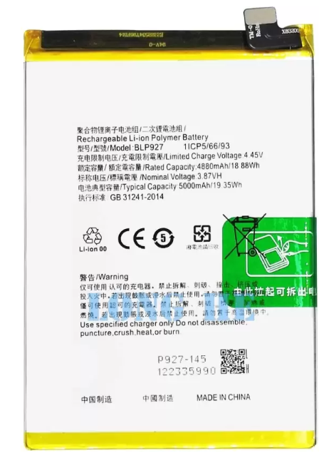 Its BLP927 Battery for Oppo CE 2 Lite 5G CPH2381 Battery. OPPO uses lithium-ion batteries in its devices, known for their high energy density, lightweight design, and long lifespan. These batteries power OPPO smartphones, providing reliable performance and fast charging capabilities. With advanced technology and rigorous testing, OPPO ensures safety and efficiency in their lithium-ion batteries, offering users a seamless experience with extended usage times. These batteries are designed to optimize power consumption, supporting features like fast charging and intelligent battery management systems. OPPO's commitment to battery innovation reflects in their lithium-ion technology, enhancing the overall user experience by delivering dependable power solutions for mobile devices.