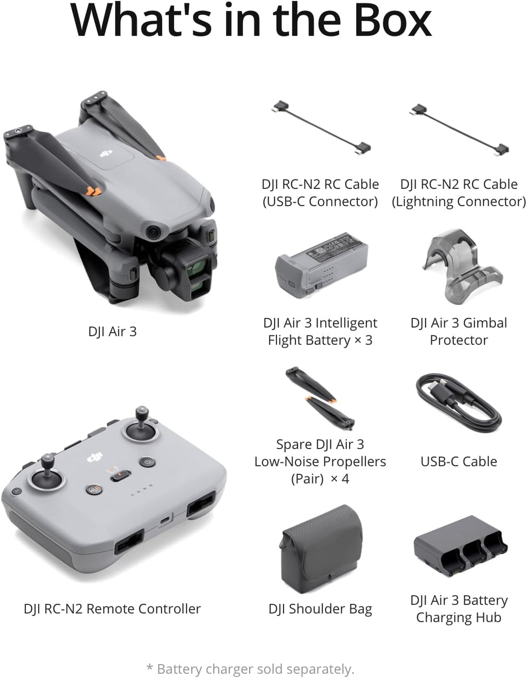 DJI Air 3 Fly More Combo with RC-N2 Remote Controller—a comprehensive aerial solution. This drone, equipped with dual primary cameras, captures stunning 4K footage and 48MP photos. With three batteries included, enjoy extended flight durations, making it perfect for capturing every moment.