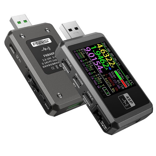 The FNB48P USB tester is a high-reliability, high-safety USB voltage, and current detection meter and a mobile communication terminal fast charging trigger. It has a 1.77-inch TFT LCD display, integrated USB-A, Micro-USB, and Type-C interface. Use a dedicated 16-bit ADC, PD protocol physical chip. It can be used to measure the power supply or power consumption of products such as USB interfaces, mobile phone chargers, and U disks; measure the charging power of mobile phones and the input and output of mobile power supplies; test the fast charging protocol of chargers.