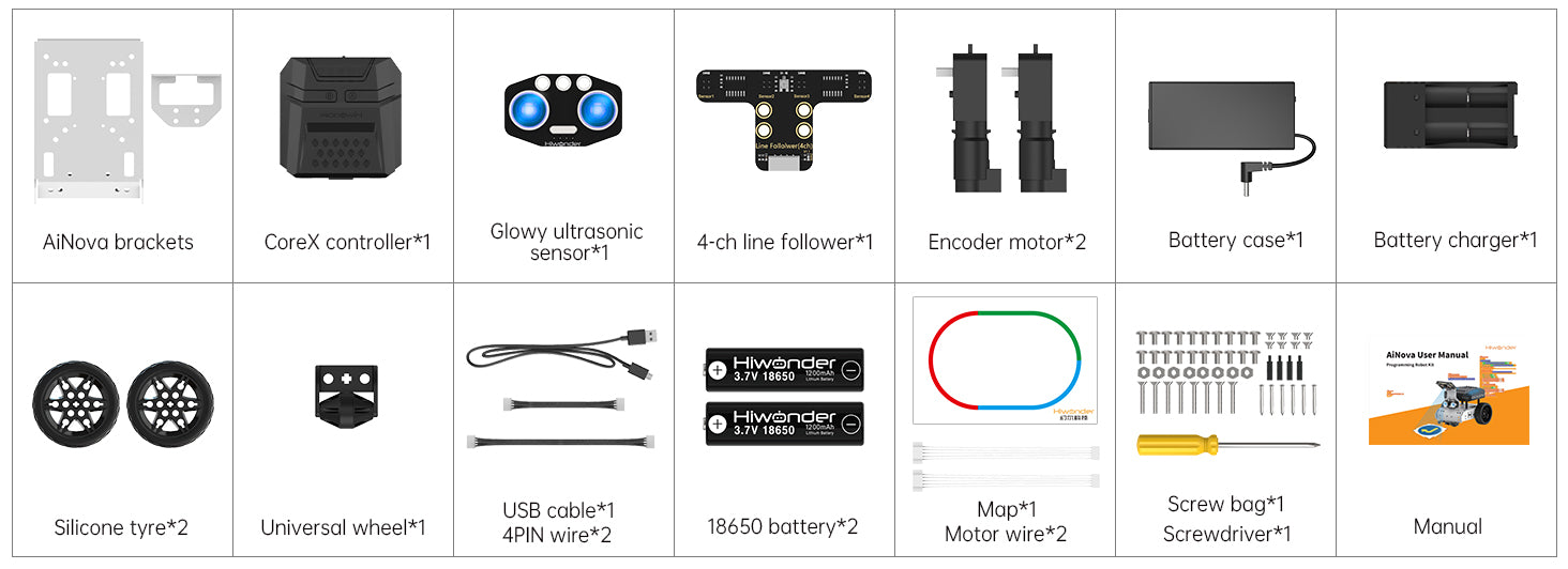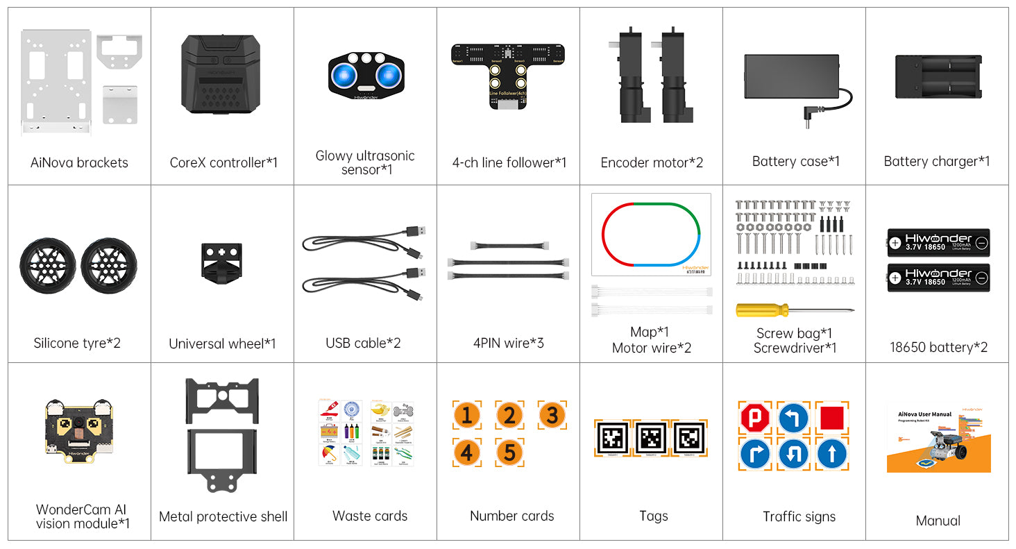 AiNova is a next-generation AI technology education robot based on graphical and Python program. Loading with CoreX controller, encoder motors, 4-channel line follower and glowing ultrasonic sensor, it can perform line follow, obstacle avoidance, etc. The standard version integrated with WonderCam vision module is available for AI games such as Autonomous Driving, Vision Line Follow, Tag Tracking, etc.