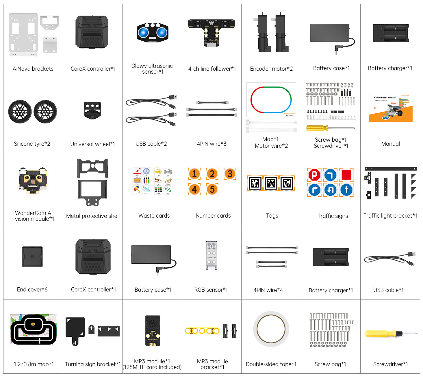 AiNova is equipped with the WonderCam Al vision module that supports image recognition. User can program AiNova to implement a variety of games such as color recognition, number recognition, road sign recognition, tag recognition, etc.