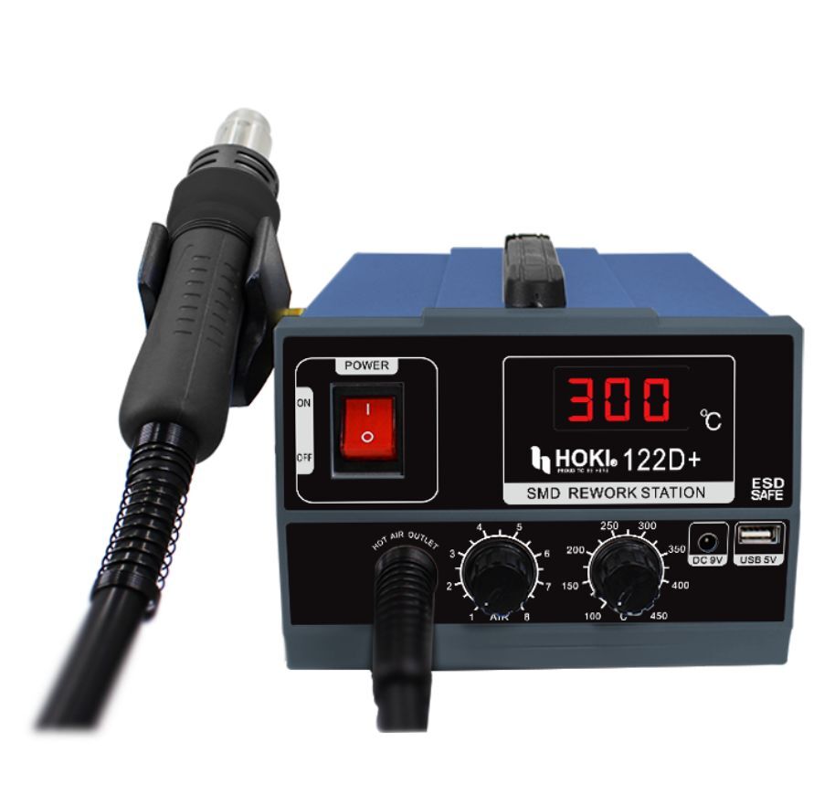 A HOKI 122D+ Rework Station is a Digital SMD with a Soldering iron. It uses an inlet heating element the type of heating element and nozzle are the same as the international one.