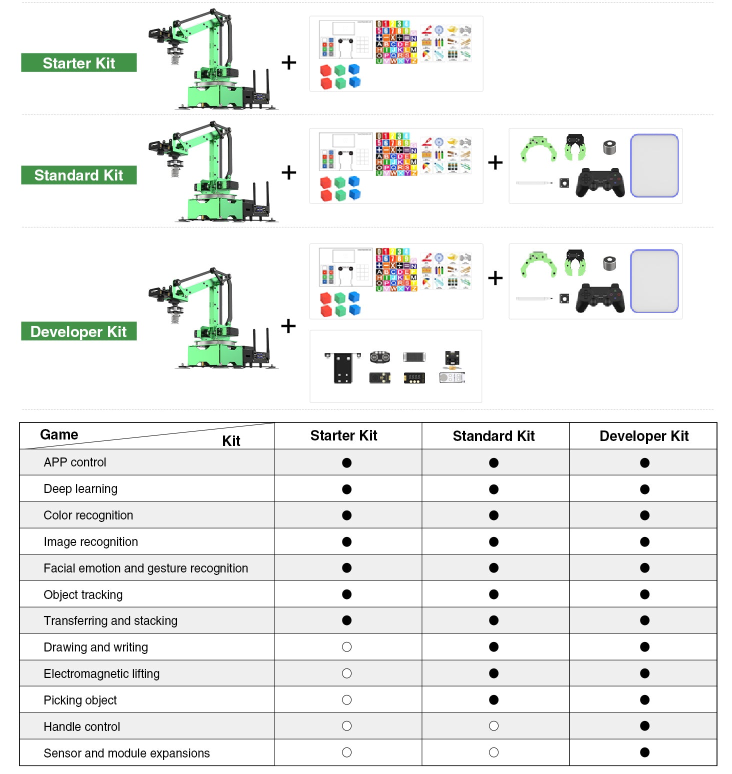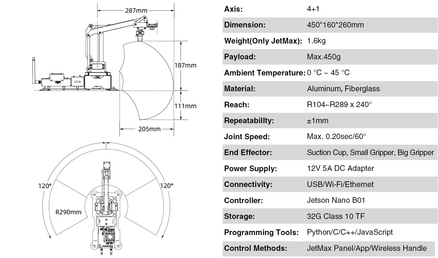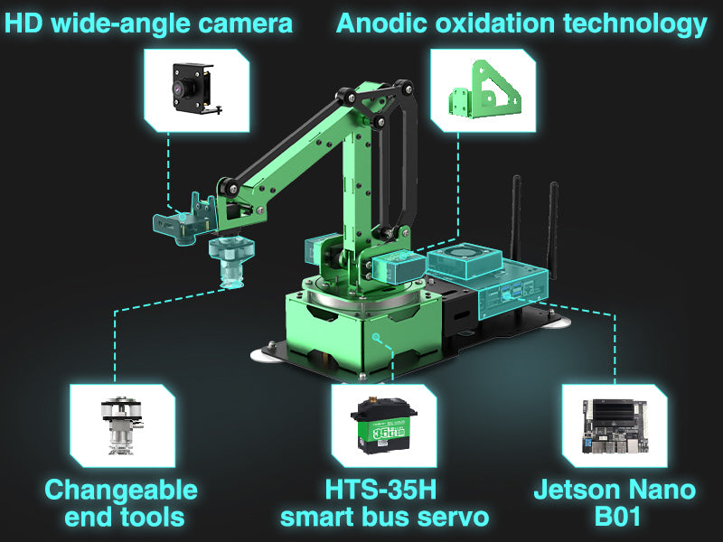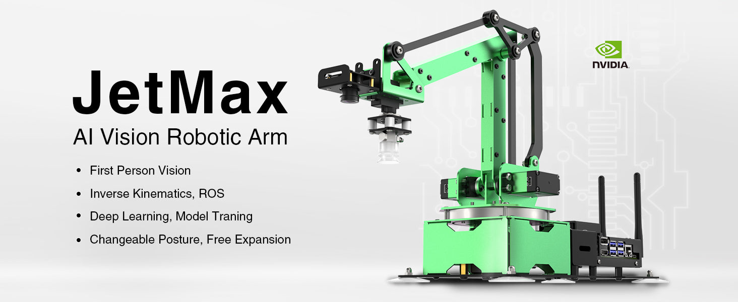 JetMax is the best AI robotic arm powered by NVIDIA Jetson Nano. It is equipped with HD wide-angle camera and high-quality smart bus servo, adopts ROS robot system and supports Python programming. Through deep learning and AI vision, this robotic arm can perform multiple tasks, such as color tracking, waste sorting, gesture recognition, face tracking, mask identification. Via Android/iOS mobile APP, PC computer, mouse and wireless handle, you can control it at your fingertip.