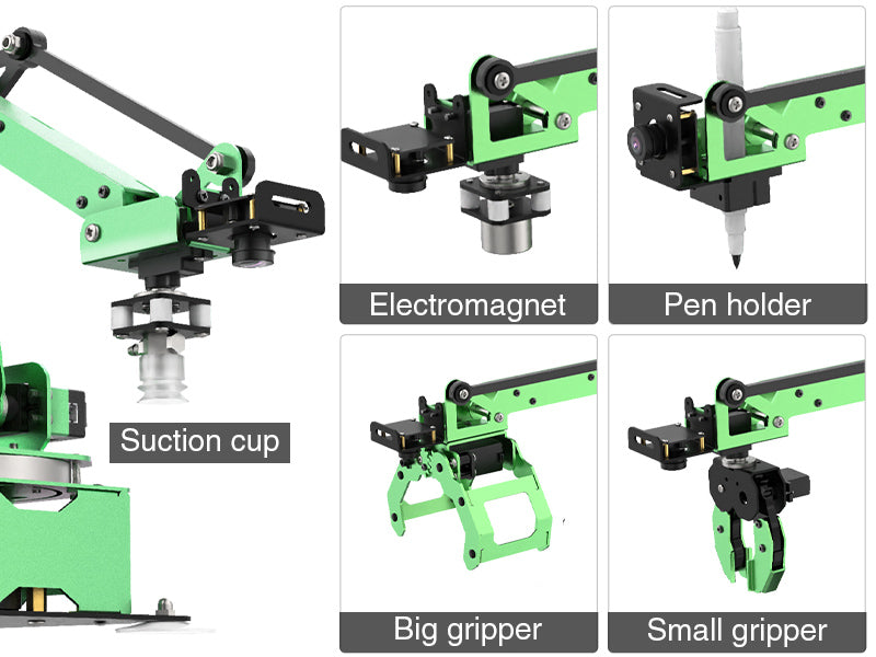 Various Changeable End-of-arm ToolsThe end of JetMax can be fitted with air pump suction nozzles, gripper, electromagnetic suction cup, pen holder, pen, etc., to adapt to more AI scenarios. |