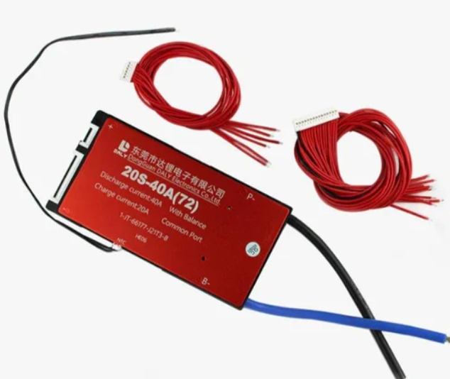 Its Li-ion NMC 20S 72V 40A Battery Management System. This charge-discharge controller module can be concurrently connected to 20 rechargeable batteries in series. The module is protected from overcharge, over-discharge, and short circuits. When at least one battery reaches its maximum capacity, the charge controller among its functions is to cut off the electricity to the batteries. 40 A is the maximum permitted current. The charge controller engages the protection mode if the supplied voltage exceeds the maximum permitted value. (P-) For the Power Negative terminal and (B-) for the battery Negative Terminal.