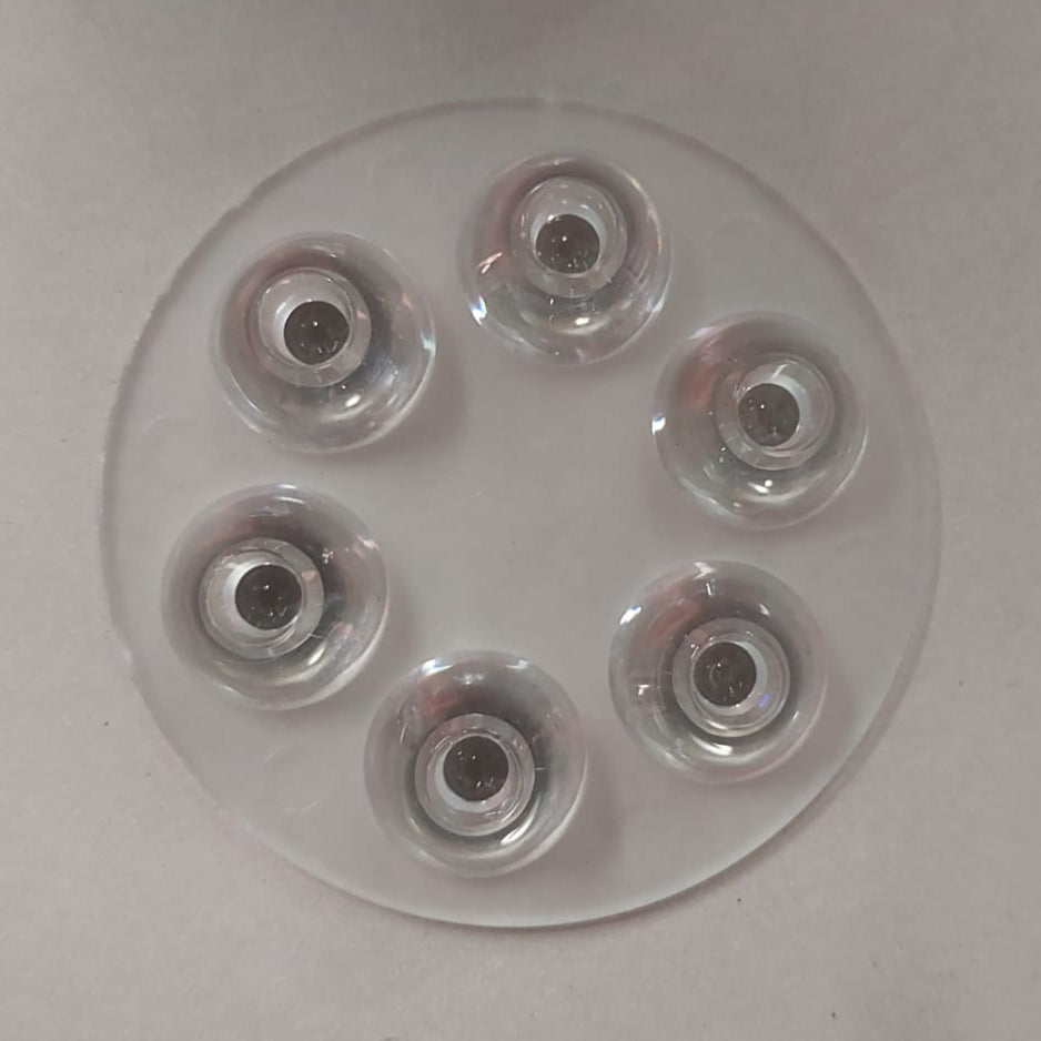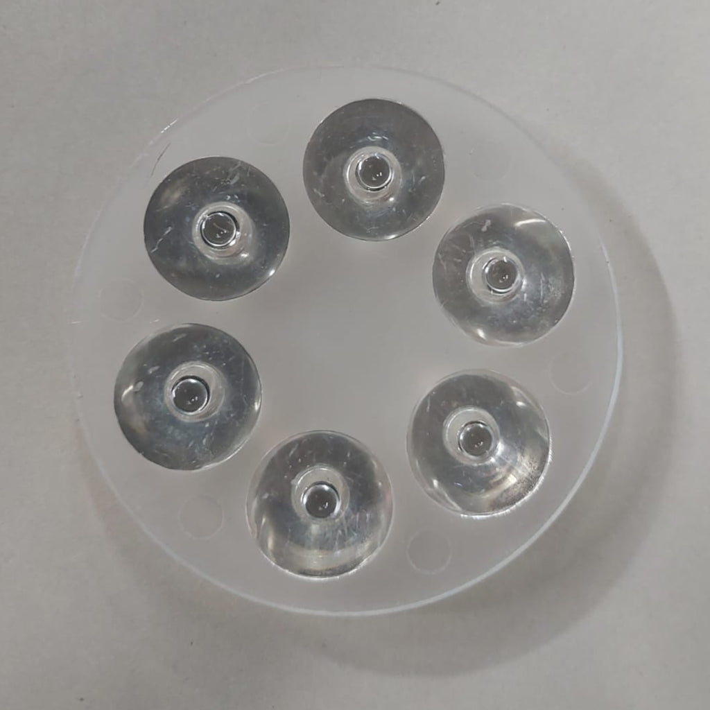 A high-efficiency water clear power LED lens unit intended for use with the 6x LED round modules. A material with excellent thermal stability is required. Polycarbonate resins offer superior thermal stability compared to acrylic resins and can be used for continuous temperatures up to 120°C.