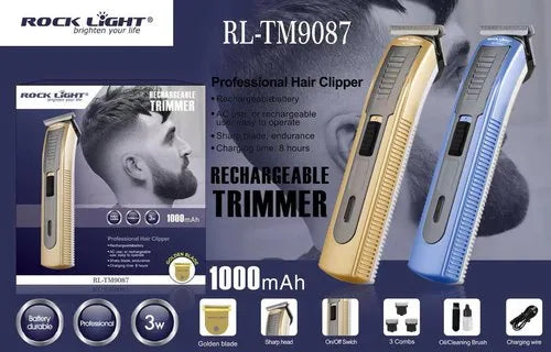 The ROCK LIGHT RL-TM9087 hair trimmer is a professional-grade grooming tool featuring a powerful motor, precise blade adjustment, and ergonomic design for smooth, efficient cutting. Ideal for barbers and home use, it ensures clean, precise haircuts with minimal effort.
