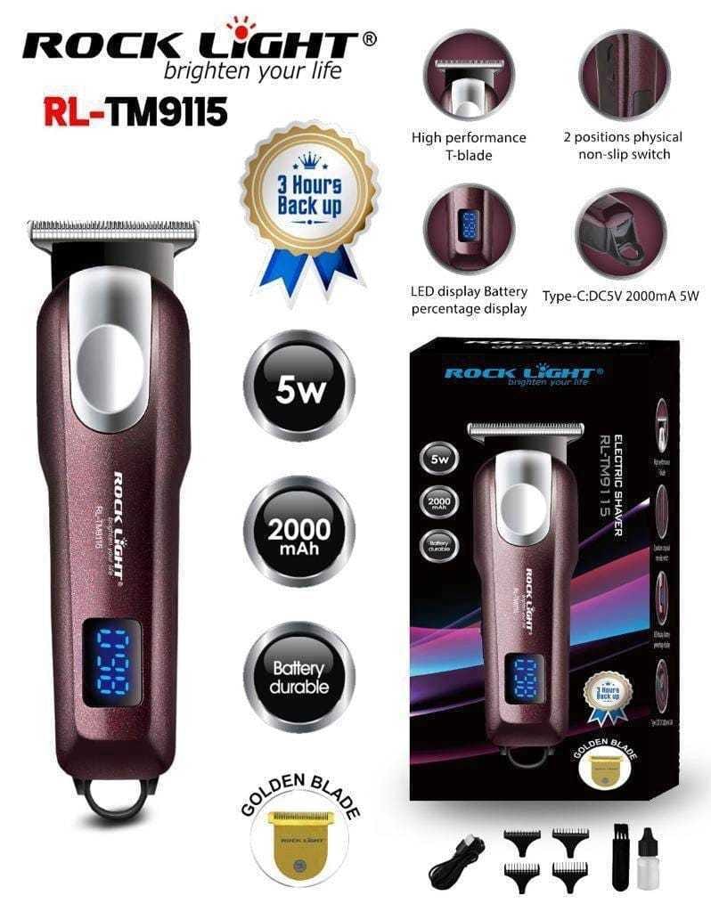The Rocklight RL-TM9115 is a 5W trimmer featuring a battery display. It is designed for efficient trimming, offering a precise grooming experience. The battery display allows users to monitor power levels, ensuring uninterrupted use during grooming sessions.